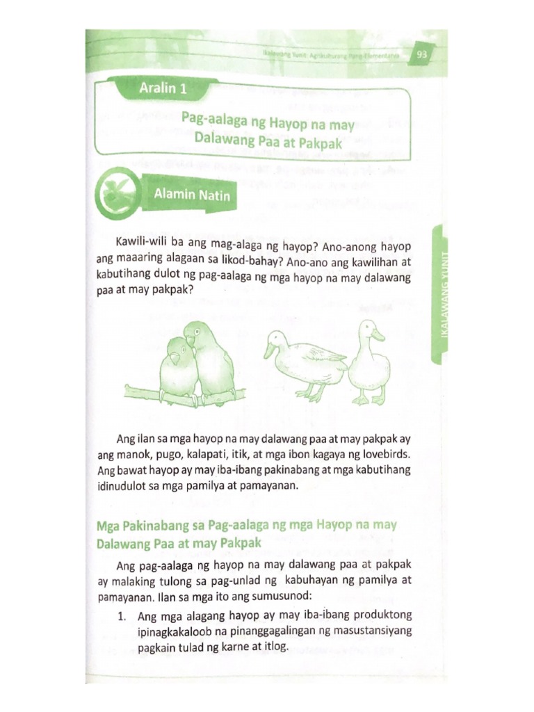 Matutuhan mo rin ang mga hayop na akmang alagaan sa bahay o bakuran na maaring mapaglibangan o mapagkakitaan. Sa unang tingin hindi nito kamukha ang isang hayop. Naipaliliwanag ang kabutihang dulot ng pag-aalaga ng hayop na may dalawang paa at pakpak o isda.